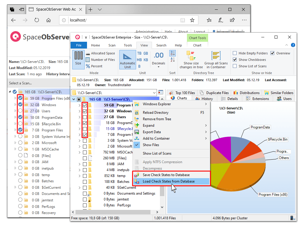 The SpaceObServer Web Access grants remote access to scans created by the SpaceObServer Enterprise Edition: the Web Access connects to the SQL database and receives scan data. It processes the data into clear tables and diagrams. End users open the SpaceObServer URL in their web browser and log in with their Windows accounts (Active Directory). The Web Access is hosted via the Internet Information System (setup configures it automatically). Logged in users can only access reports for which they have permissions.